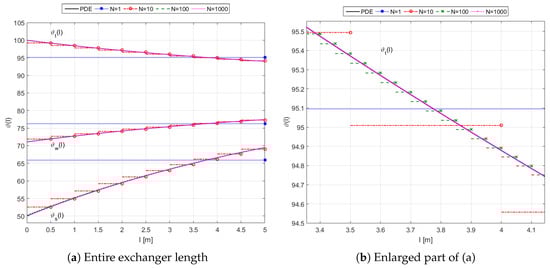In the case of LPSs, where the spatial effects are neglected or averaged, their steady-state solutions provide information about the static input–output mappings of the system. For the DPSs which are usually mathematically described by PDEs, their steady-state solutions also contain information about the fixed distribution of the physical quantities inside their spatial domains. Therefore, for the double-pipe heat exchanger considered here, the steady-state solution provides not only information about the constant outlet temperatures and of both fluids in the thermodynamic equilibrium conditions, but it also describes constant temperature profiles , and along the axis of the exchanger, which may be of great importance, e.g., from a technological point of view.