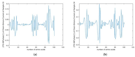 (a) The plot of of the Chern–Simons current in the genetic code of TERC gene in telomerase with 1069 alphabet codes (Appendix C). (b) The plot of of the Chern–Simons current in PD1 protein. (c) The plot of of the trend of the Chern–Simons current in PD1 protein.