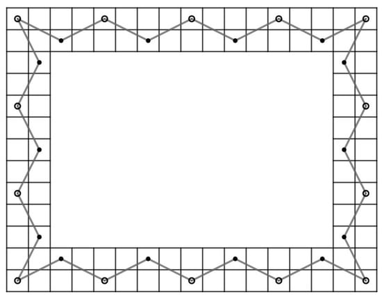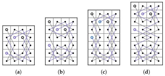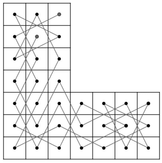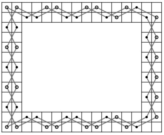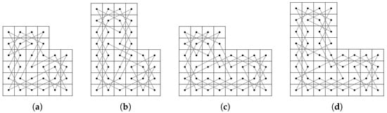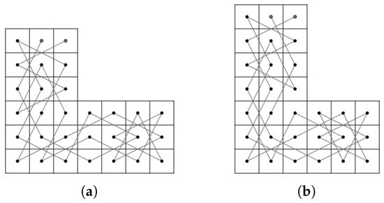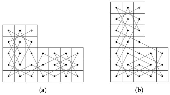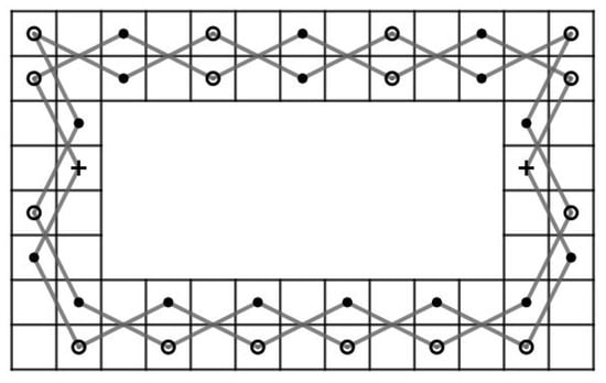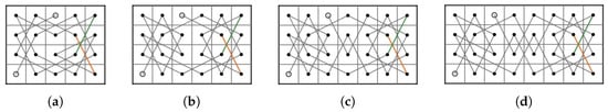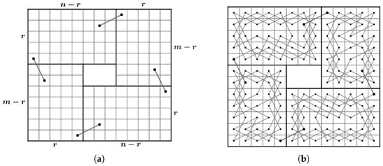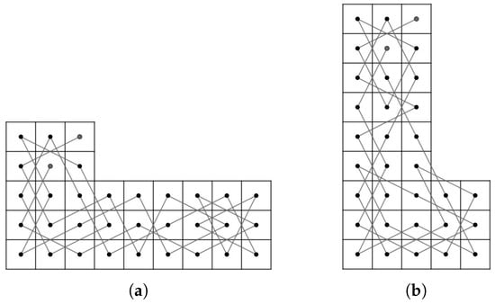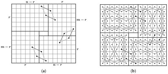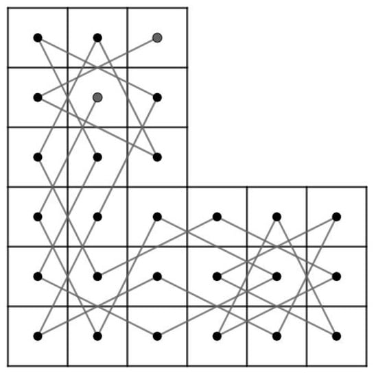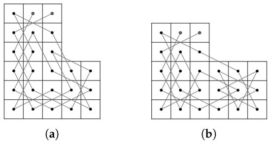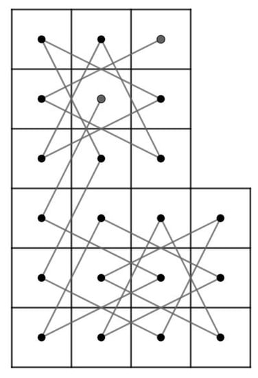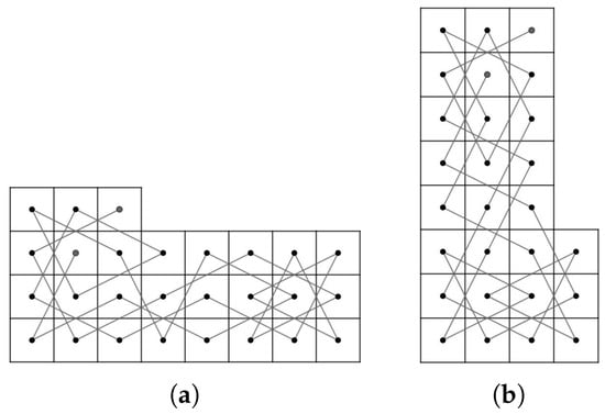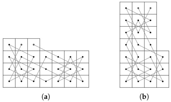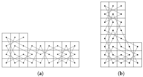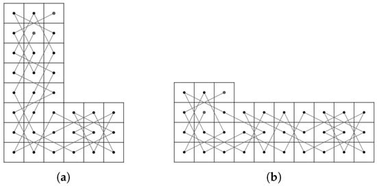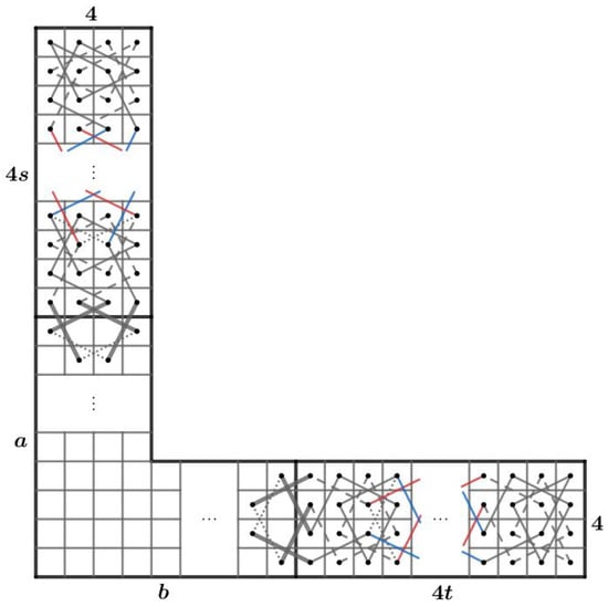 - Case 1: there exist nonnegative integers such that and . We divided the LB into subboards, CB() (Figure 17) and LB (Figure 11a) if and and LB (Figure 11a) and CB() (Figure 16) if and . Otherwise, we divide into three subboards, CB() (Figure 17), LB (Figure 11a) and CB() (Figure 16). Then, we construct the required OKT by the following two steps.