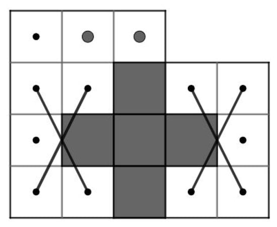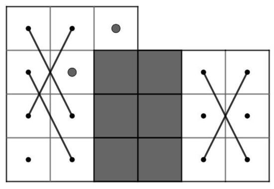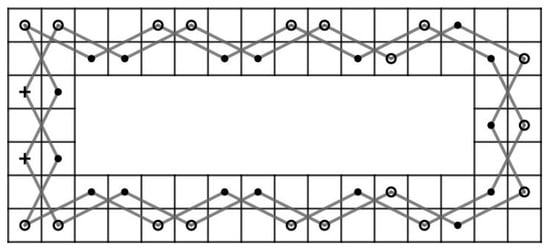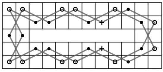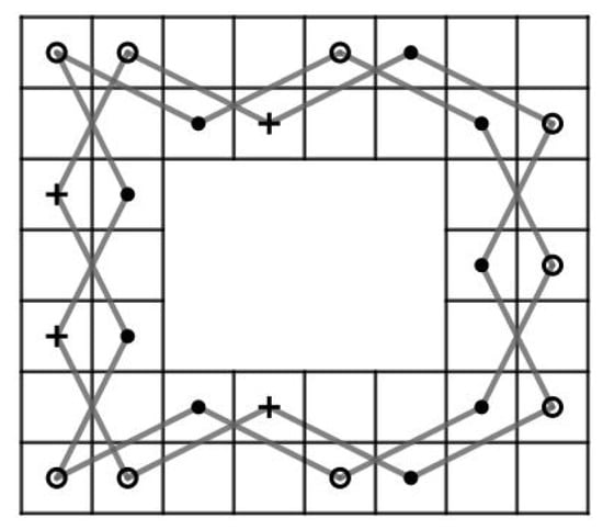 For and , let G be a knight graph of the LB. Consider . Since the LB contains an OKT from to , has a Hamiltonian path. Let . Then, as shown in Figure 9. By Theorem 3, we obtain a contradiction.
