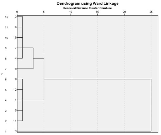The hierarchical group analysis performed using hierarchical cluster analysis resulted in a Q-type cluster with an arbitrary similarity level of 50%. The samples were clustered into three (3) groups with the first group consisting of M3, M8, M4, M5, M1, M10, M11, M12, M2, and M6; the second group consisting of M9; and the third group consisting of M7. Sample M7, which differed from the other data, had a separate cluster.