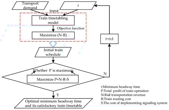 To solve this problem, a mixed integer linear programming model is formulated, in which the transport demand corresponding to different origin and destination stations, train stop planning, train routing and train timetabling are included in the model formulation. In this train timetabling process, first of all, the transport demand and minimum headway time are regarded as inputs into the proposed train timetabling model, to obtain an initial train schedule with an objective function of maximizing the profit of rail transportation revenue and train routing cost. Then, we vary the minimum headway time t to evaluate the initial train timetable by maximizing the total operational profit of rail transportation revenue, train routing cost and the cost of implementing signaling system. Finally, we obtain the optimal minimum headway time and its corresponding train timetable. The whole optimization process in this paper is shown in Figure 2.
