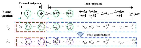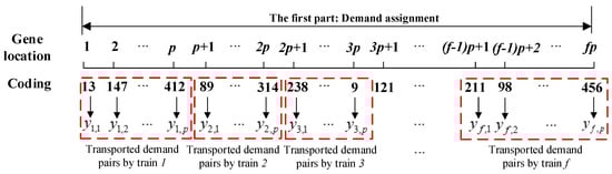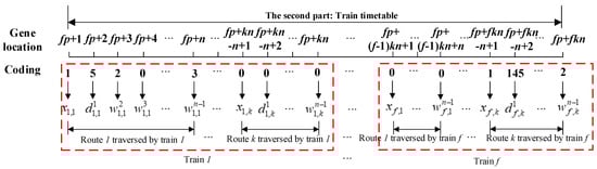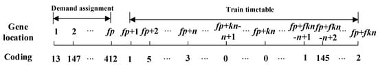 To code the chromosome in GA, the variables are divided into two parts. Transport demand assignment is the first part of the chromosome shown in Figure 3. Each train occupies p genes to transport the demand pairs as much as possible. Furthermore, variables of train routing, departure time at the first station and dwell time at the intermediate stations are the second part of the chromosome shown in Figure 4 to represent a train timetable. Each train has k routes available to traverse, but it can only choose one of them. is a binary variable that represents whether train f traverses on route k. represents the departure time at station m (m = 1,…, n, n is the number of traversed stations) when train f traverses on route k and represents the dwell time at station m. Both of these two parts compose an individual in GA shown in Figure 5.