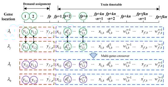 - Step 2. If r, then crossover operation will randomly select some positions of genes in two parts of the chromosome. In the first part of chromosome, randomly select multi-genes and perform crossover operation. While, in the second part, randomly select multi-genes representing train f and perform crossover operation.
