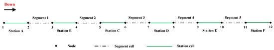We adopt the Cplex solver version 12.6.3 with default settings to solve the MILP models. In this example, we consider a double-track railway line corridor with six stations, and only the down direction is tested for simplicity, as shown in Figure 9. The number of all related nodes and cells in the experiments are 12 nodes and 11 cells. Trains of downward direction originally depart from station A and finally arrive at station F, while vice versa for the trains of upward direction. In this small-scaled example, the planning time horizon is from 8:00 to 13:00 (set as 300 min).