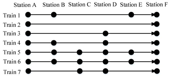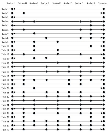 Using the data given above, we design the codes in the Cplex solver. As a result, we finally obtain a train timetable (shown in Table 6), a stop plan (shown in Figure 10) where the solid dot “•” represents a train stop, and a demand transportation assignment plan (shown in Table 7). The result shows that when the minimum headway time is 3 min, seven trains can carry a demand of all 4230 with a profit of CNY −1,979,212. The result demonstrates the validity of the proposed model.
