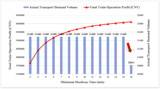 To find the optimal minimum headway time, we fix other parameters and vary the minimum headway time from 3 min to 16 min. Then the computational results with different minimum headway times obtained by GA are shown in Figure 11.