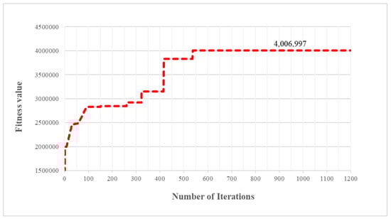 From Figure 11, we can see that when the minimum headway time increases from 3 min to 15 min, the total profit of train operation increases simultaneously, with the actual transport demand being stable. When the minimum headway time increases from 15 min to 16 min, the total train operation profit has a less significant increasing trend; in addition, it is interesting to see the transport demand declined from 21,489 to 20,814. This finding shows that when the minimum headway time is set as 16 min, some transport demand is not satisfied, although the total train operation profit increases. This is because there exists a train that cannot be scheduled in the train timetable within the planning horizon. It also indicates that the minimum headway time has a significant influence on train timetabling, which requires us to optimize the minimum headway time, not only to meet the transport demand, but also to minimize our basic rail transportation costs. Therefore, from the results above, 15 min is found to be an optimal minimum headway time in train timetabling in this paper. Based on the optimal minimum headway time, we use GA to compute its corresponding train timetable, and the iteration process of GA is shown in Figure 12.