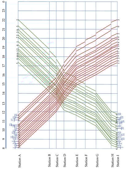 The train stop plan with the optimal minimum headway time (t = 15 min).