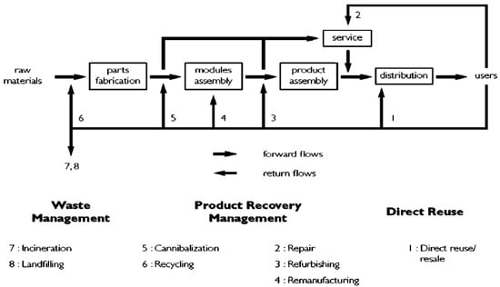 Schematic diagram of product production and recycling. (Data source: Thierry M., Salomon M., Van Nunen J., Van Wassenhove L. (1995) []).