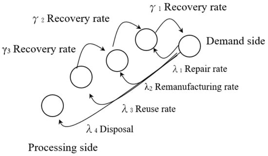 The impact of environmental responsibility on the manufacturing business model is becoming higher and higher, and the products produced by different industries have different environmental loads. Moreover, the life of the product will vary with the frequency of use or the environment, resulting in differences in surface luminosity, short circuit, damage, or scrapping process. Products produced in different industries have different environmental hazards and different levels of recycling. This study considers different recycling levels for a single project as shown in Figure 1 (Thierry, M., et al. (1995) []). In other words, the recycling status can be roughly divided into transfer, polishing, maintenance, remanufacturing, crushing, burying, incineration.