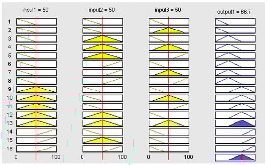 The established weights for triangular fuzzy numbers input variables input1, input2, input3, respectively, indicate the degree of damage, processing cost, mileage, and output indicates the classification of the recycling process shown in Figure 6.