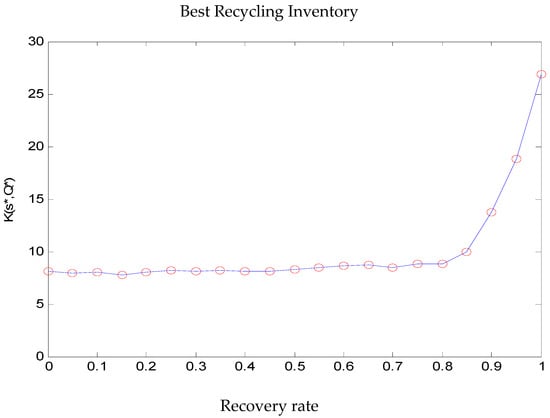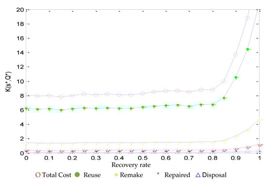 We used the parameters derived from fuzzy theory (disposal, reuse, remanufacture, repair) = (0.012330, 0.770150, 0.173873, 0.043647) in the inventory formula Equation (9). Figure 9 shows a trend chart of total inventory cost of different levels of recovery rates.