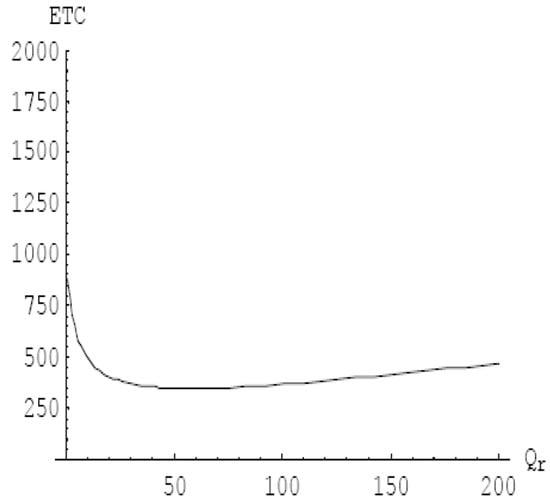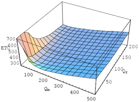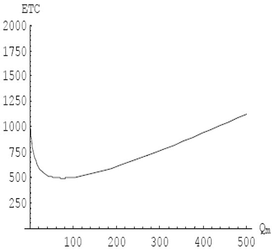 For the analysis of Qm and Qr, when the remanufacturing batch Qr of the recycling processing center is 10, the order batch, Qm, is 75 and the minimum ETC value is 494.603. We can see the changes in Qm and ETC in Figure 10. Conversely, when the manufacturing center’s order batch Qm is set to 80, the remanufacturing batch, Qr, is 58 and the minimum ETC value is 348.07. The changes in Qm and ETC can be seen in Figure 11 and Figure 12.