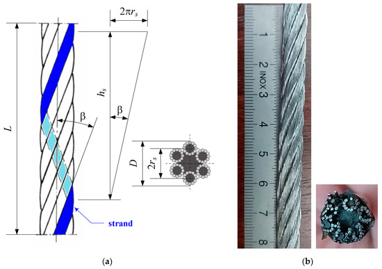 The evaluation of the wire rope geometrical parameters: (a) The model of the strands wire rope, used for evaluation of the parameters involved in the lay angle computation of the strand and the rope, respectively [23] (p. 25); (b) detailed images of the wire rope used for the experiments, showing longitudinal and sectional views.