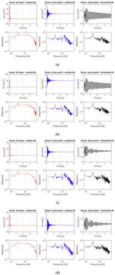 The diagrams in Figure 5 present the results of a joint time-frequency analysis [22] of the absolute motion of the loading mass in terms of acceleration. The exclusive motion of the mass results through elimination of the parasitic motions, recorded on the upper hanging device, from the signal directly acquired at the loading point (see Figure 1). The absolute acceleration of the mass, as a function of time, is presented in Figure 6, together with its spectral composition. Obviously, the diagrams in Figure 6 are related to each testing situation. The essential magnitudes were evaluated and red circles were marked on the spectral diagrams in order to identify the minimum set of eigenfrequencies in the system evolution. The evaluation of these points was performed with the help of a computational routine which identifies the peaks within the signal [22] that simultaneously satisfy the following conditions: Minimum height raised above 10% of maximum magnitude and prominence greater than 0.03 (value adopted based on the initial analysis of all signals spectra). The procedure only takes into account the first five peaks, because the analysis of high frequency range does not meet the purposes of this research. These aspects have to be mentioned because of the various numbers of marked peaks on the spectra graphs in Figure 6.
