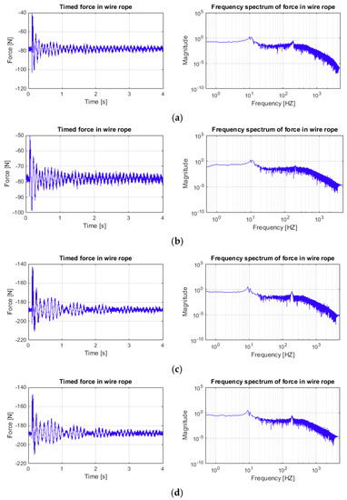 As it can be seen in Figure 6, the peaks were grouped around 10 and 200 Hz. For the cases/situations within this paper, the frequency values of marked peaks in Figure 6 are presented in Table 1. For the first case (m = 8kg), the scanning procedure identified five values in each situation. For the second case, the procedure yielded only three values, where all attended the domains of interest. Additionally, identified components at 2.5, 6.75, 220, and 302 Hz appeared in a certain singular situation. However, following the graphs, it can be clearly seen that these dominant frequencies were also included by all signals, but with various amplitudes and prominences, thus that they were not constantly pointed out by the algorithm. Low values (2.5 and 6.75 Hz) result from the cable transversal parasitic oscillations and high values (220 and 302 Hz) results from the dynamics of the hooking devices.