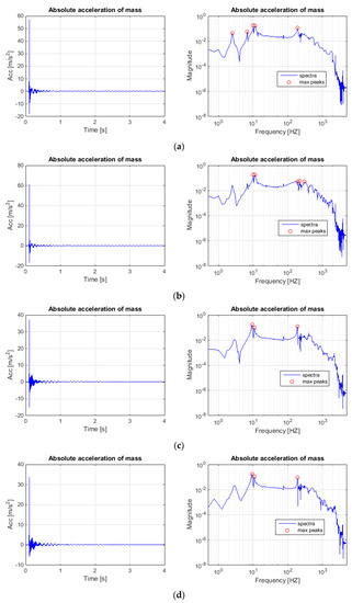 Timed evolution and related spectral magnitude of the absolute motion in terms of acceleration, recorded at the loading mass: (a) First situation within the case of m = 8 kg; (b) second situation within the case of m = 8 kg; (c) first situation within the case of m = 19 kg; (d) second situation within the case of m = 19 kg. Note: Red circles on the right-side diagrams denote the maximum peaks satisfying the imposed conditions (see text for details).
