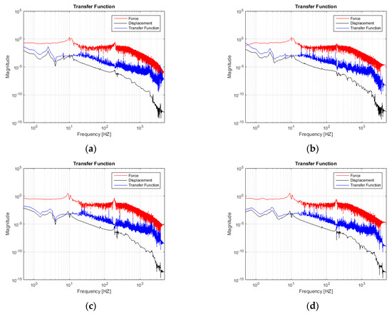The authors have evaluated the transfer function, taking into account the force signal, as the input to the system, and the loading mass acceleration signal, as the output of system [22,24,29]. In order to facilitate a comparative analysis between excitation, the transfer function, and system response, Figure 7 simultaneously presents the three spectra (in terms of the FFT magnitude). The four groups of diagrams in Figure 7 correspond to each considered test.