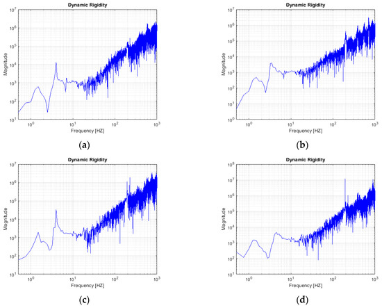 One interesting parameter that is able to characterize the system behavior under dynamic excitations is the dynamic rigidity [30]. This parameter relates to the perturbing force with the system response (in terms of displacement) and provides information regarding the dynamic evolution of this ratio in respect to the perturbation frequency. The spectra of dynamic rigidity, according to the four considered cases, are presented in Figure 8.