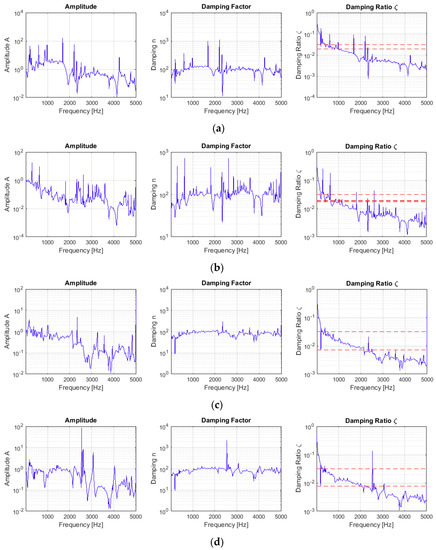 Hereby, the diagrams in Figure 9 show the amplitude, damping factor, and damping ratio respectively, in respect to the frequency. These diagrams were grouped according to the four presented experimental cases. Supposing that the Prony algorithm directly provided amplitudes and damping factors, the damping ratio was subsequently evaluated based on the available data from the Prony/MPM implementations. In addition, an equivalent value of the damping ratio was estimated using the hypothesis of the same energy values supplied for both the initial system (simulated by the finite sum of exponential functions) and for an equivalent single-degree-of-freedom (SDoF) system with a natural frequency identical to the dominant frequency within the signal spectra [22,30,31,32]. Taking into account the five maximum dominant spectral peaks previously evaluated, this results in the five maximum values of the equivalent damping ratio. These equivalent values are depicted in the damping ratio graphs within Figure 9 with dashed red lines.