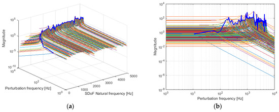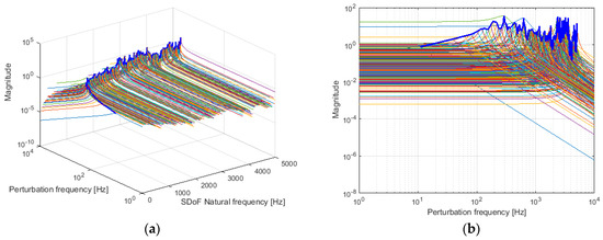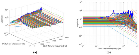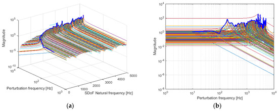 These cumulative responses have a graphical representation, such as a function of two variables, e.g., the perturbation and the natural frequencies (see Figure 10a, Figure 11a, Figure 12a and Figure 13a). The correlated overlapping spectral diagrams, following the SDoF natural frequency parameter, are presented in Figure 10b, Figure 11b, Figure 12b and Figure 13b. The global response of the equivalent MDoF model was depicted using a blue continuous thick line on each diagram within Figure 10, Figure 11, Figure 12, Figure 13 according to the assumed tests/cases for presentation.