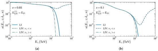 which significantly changes when LIV is considered, such that, if LIV is subluminal , while it is >1 when LIV photons are superluminal. That is, subluminal LIV predicts more photons arriving from further distances and sources, while superluminal will significantly reduce the expected gamma rays from distant sources [44,45].