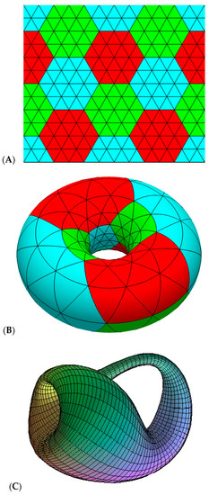 So-called “graphenic nano-structures”: (A) the graphene graph as a 2D structure “with boundary”; (B) the torus variety; and (C) the Klein bottle variety, as the 2D manifolds without a boundary; see the text for more details regarding the Möbius strip, see [2].