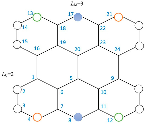 In the current paper, we do not use the distorted parallelogram mesh often seen in the literature to build the polyhex graphs; instead, we adopt the quadrangular honeycomb mesh. The graphs shown in Figure 2, Figure 3 and Figure 4 are constructed by the usual [12,13,17] C-shaped unit cell made by four atoms—1, 2, 3, and 4—and which is translated times along x and times in y, where the integers LM and LC indicate, respectively, the lengths of the Möbius-like edge (subject to the antiparallel sewing) and the cylindrical edge (parallel sewing), both expressed as the number of hexagons. The graphenic open lattice is made with rows with hexagons. The number h of total hexagons in the belts is then . By closing the edges, the numbers of atoms N and bonds B in the graph are: N ,.