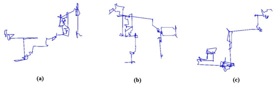 This article describes three Lévy flight paths as shown in Figure 2a–c. In the picture, the parameters are set as follows: is a constant 1.5, the number of steps is set as 200, and the number of dimensions is set as 10. As we can see, the paths in the three pictures are very different, which can effectively demonstrate that Lévy flight is a random walk mechanism. However, there are some long walks after short walks. In Lévy flights, exploratory local searches over short distances are the same as occasional longer walks, ensuring that the system does not fall into local optimality. Lévy flight maximizes resource search efficiency in uncertain environments. The random number algorithm is used to draw three Lévy flight paths with 200 consecutive steps on the plane, as shown in Figure 2. The strategy ensures that the improved moth-flame optimization algorithm avoids falling into local optimality.