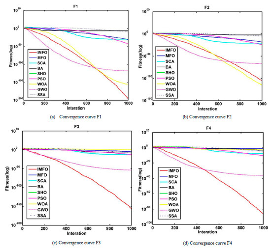 In the standard MFO algorithm, the full-dimension update evaluation strategy is adopted; that is, after updating all the dimension information, the updated solution is evaluated according to the value of the objective function. This method, [29], will, to some extent, obscure the information of the evolutionary dimension, waste the known evaluation times and worsen the convergence rate of the solution. At the same time, such an updating mode causes mutual interference between dimensions, which affects the convergence speed and optimization accuracy of the algorithm. Assuming that the objective function and the global optimal solution for , the optimal value of . Supposing the algorithm iteration solution is the first k generation of the ith solution for , the objective function value of . In the process of the iteration algorithm, the first hypothesis according to Formula (5) is that the overall updates to (0, −1, 0), resulting in the objective function value of . According to the objective function evaluation mechanism, ; the updated solution compared to the original objective function value is big, so the algorithm will retain the original objective function values and discard the updated value of the target function. However, the value of the updated solution in the first dimension evolves from the previous 0.5 to 0 and and the value of the third dimension evolves from 0.5 to 0, but since the value of the second dimension degrades from 0 to −1, the algorithm will discard the updated solution directly in the evaluation strategy of the full dimension update. Therefore, this evaluation mechanism will waste the evaluation times of the solution and worsen the convergence rate.