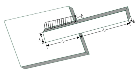 The objective of this model is to determine the minimum manufacturing cost [36]. Figure 8 shows the welded beam and parameters involved in the design. In this case, four variables affect the manufacturing cost, including the height of the reinforcement (t), the thickness of the weld (h), the thickness of the reinforcement (b) and the length of the reinforcement (l). The optimal design of this problem must satisfy the constraint conditions: shear stress (), bending stress in the beam (), deflection of the beam (), and buckling load (). The mathematical model of the problem can be described as: