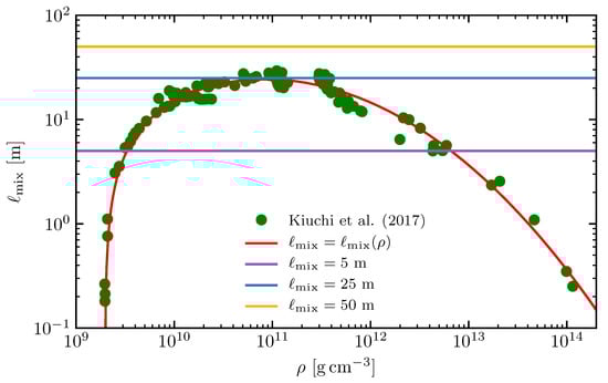 Mixing length evaluated from the general-relativistic magnetohydrodynamics (GRMHD) simulations of Kiuchi et al. [] (dots) and the fit employed in this work (red line). Shown also are the other values of employed in this and in our previous works. GRMHD simulations favor relatively small values , in agreement with the simple analytic estimate in Equation (20).