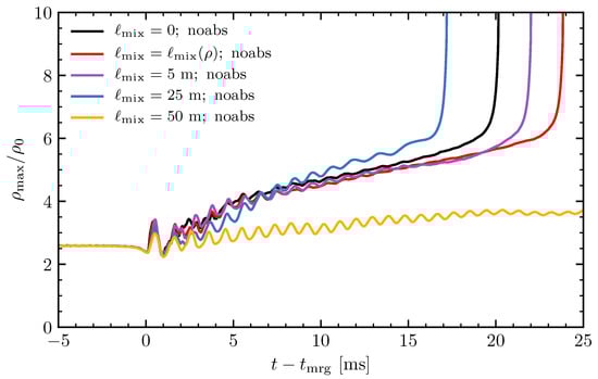 The evolution of the maximum rest-mass density for the five binaries that did not include neutrino heating is shown in Figure 2. As previously reported in [], we found that the turbulence on the lifetime of the remnant was non-monotonic. This was due to the complex interplay between angular momentum transport and suppression of angular momentum losses to GWs operated by the turbulence []. However, only the simulation with the largest mixing length (), corresponding to very efficient turbulent transport, showed truly significant differences in the contraction rate and in the lifetime of the remnant when compared to the baseline model with . In the other cases, the changes were quantitative rather than qualitative. This was not surprising: turbulent viscosity played a small role in the inner core of the MNS because the velocity gradients were relatively small towards the center of the MNS [,,]. These findings were consistent with the results of the GRMHD simulations of the same binary presented in []. There, it was found that the inclusion or omission of the magnetic field (and hence of the MRI-induced turbulence) had a modest effect on the collapse time of the remnant, with the difference of the same order as those found in our Figure 2.