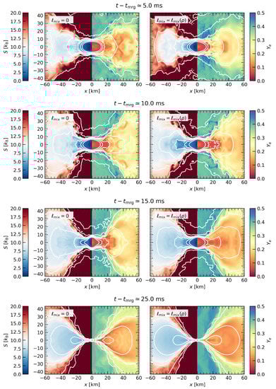 Remnant disk and massive neutron star (MNS) in the and models at four representative times. In each panel, we show color-coded values of entropy () and electron fraction () in the meridional plane. The bottom panel shows the disk configuration at the end of the simulation, when the MNS has collapsed to a BH. The white lines are the and isocontours of the rest-mass density. Turbulent viscosity mixes material from the mantle of the MNS and the inner disks and smooths the structure of the disk.