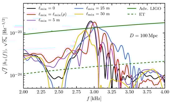 The impact of turbulent viscosity on the GW signal is shown in Figure 4. The most prominent feature of the postmerger spectrum was a peak at associated with the rotational period of the quadrupolarly-deformed MNS [,,,]. We found this feature to be robust against turbulence: deviations in the peak frequency with were typically small and of the same order of the nominal uncertainty of the Fourier transform of the time domain data. Thus, our results confirmed that the measurement of the postmerger peak frequency was a promising avenue to constrain the EOS of dense matter using third-generation detectors, e.g., see []. Models with turbulent viscosities larger than those of our calibrated model, i.e., and , also showed an overall decrease in the power of the GW signal, suggesting that turbulence might suppress GW emission, as also found in [,]. That said, significant reduction in the GW signal as found by [] would require turbulent viscosities significantly larger than those estimated from GRMHD simulations [].