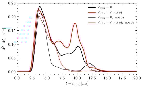 Tidal interaction between the stars prior to merger and shocks after merger drive the ejection of neutron-rich matter as the NSs coalesce [,]. In [], we studied the impact of turbulent viscosity on the dynamical ejection of matter during BNS mergers. We found that turbulence could boost the ejection of matter in asymmetric binaries, but had only a small impact on the mass ejection from comparable mass binaries, such as the system considered in this study. Here, we confirmed that these results held also when using a calibrated turbulent viscosity model. In Figure 5, we show the outflow rate of unbound matter (with ) across a coordinate sphere with radius . The differences in the overall ejecta mass were not large, considering the large numerical uncertainties associated with the calculation of the ejecta []. However, there was a clear trend in the outflow data. On the one hand, turbulent dissipation did not effect the outflow rate at early time, when fast material accelerated when the remnant rebounded reached the detection sphere. On the other hand, the runs had significantly larger outflow rates at later times, when the slower part of the dynamical ejecta crossed the detection sphere. This is visible for the simulations in Figure 5. Simulations with other values of followed the same trend, but are not included to avoid cluttering the figure. This late time boost of the outflow rate was likely the result of the increased thermalization of the flow due to turbulent viscosity and the resulting larger pressure gradients.