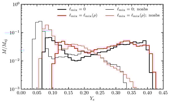 Both viscosity and neutrino reabsorption played an important role in the determination of the electron fraction of the ejecta [,,,,], as shown in Figure 6. This quantity is of particular interest since it most directly determines the outcomes of the r-process nucleosynthesis for the thermodynamic conditions typical of NS merger ejecta []. Turbulent dissipation increased the temperatures in the outflows, activating pair capture processes, which drove to higher values through the reaction . This effect was particularly pronounced when considering the tidal tail, which corresponded to the low- peak in the outflow distribution. Neutrino absorption had an even larger effect via the reaction . Neutrinos generated relatively high ejecta, especially at high latitudes []. They also affected the tidal tail, which was irradiated after colliding with the faster shock-accelerated outflows that were launched after the merger [].