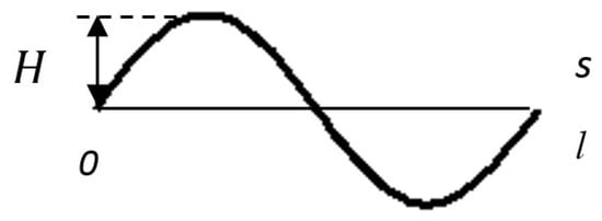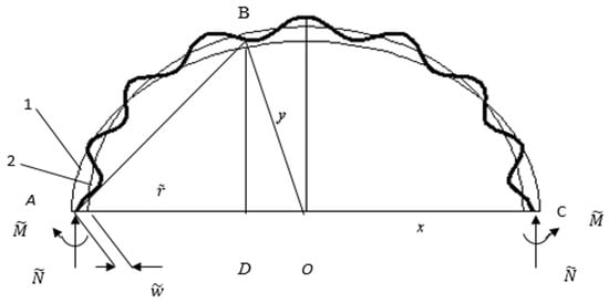 Let us replace the corrugated ring with a circular one, radius R, with the equivalent bending stiffness. To determine this stiffness, following [], we single out one corrugation wave, and due to the large number of such waves, the curvature of the basic circle can be neglected (Figure 2). Effective bending stiffness, D, is stiffness that ensures equality of deformations of the original curvilinear and approximating rectilinear beams. As a result, one obtains