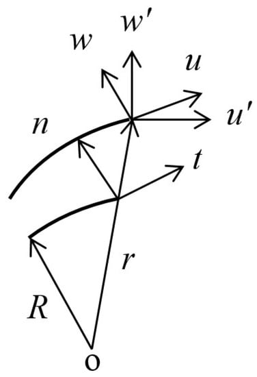 Projections of displacements on the basic circular ring. Here are the tangential and normal displacements of the corrugated ring; are the projections of these displacements on the basic circular ring; .