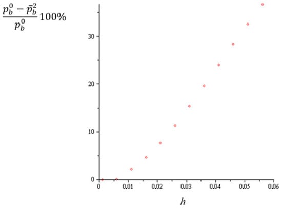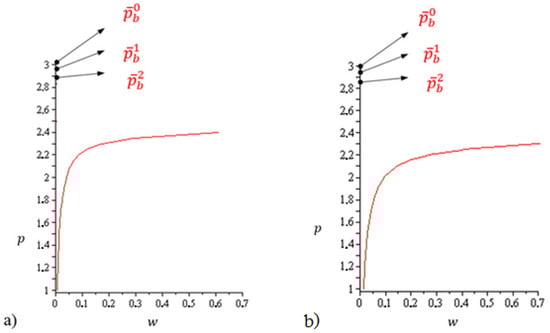 To estimate the critical pressure of the corrugated ring, the dependences of the deflection at the point were on the external pressure for corrugation profile (39) with parameters n = 16, h = 0.01 (Figure 10a); n = 8, h = 0.02 (Figure 10b).