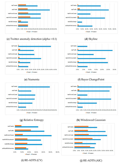 It can be seen from Figure 2 that the compared algorithms, except for the Twitter anomaly detection and RE-ADTS methods, showed a relatively small recall compared to their precision. In other words, most of the compared algorithms tended to detect a large number of false normals with an extremely low proportion of actual anomalies correctly. However, the RE-ADTS increased the number of true detections of anomalies.