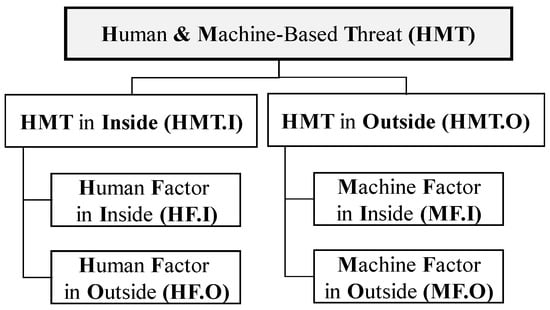 To design an analytic hierarchy process (AHP) [43] model for artifacts related to cyber-attack types, we analyzed various threat logs generated in conventional information and communication technology (ICT) systems in detail. Several inside threat acts were detected by inducing different combinations of these logs. As shown in Figure 1, we classified threats and divided the acts for each threat criterion to establish various scenarios that could occur in the inside and outside environments and to estimate the risk for each attack type.