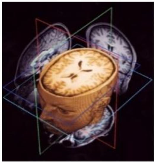 Brain biopsy and brain imaging systems are the common techniques used for the diagnosis of tumors and their cause. In open biopsies, a small hole is drilled into the skull and a tiny piece of tissue is extracted to examine the tumor under a microscope to determine its type, composition, and cause (see Figure 1). This technique is highly risky to human life. The development of medical imaging technologies has revolutionized medical diagnosis allowing doctors to detect tumors earlier and improving the prognosis. Tumor type, size, and position are now able to be determined using Magnetic Resonance Imaging (MRI) scans. Furthermore, MRI can differentiate soft tissue and detect small changes in tissue density and physiological mutations associated with tumors [,]. Moreover, an advantage of the use of MRI scans for brain tumor diagnosis is that the procedure does not rely on the use of ionizing radiation [,]. In general, an MRI image of the brain consists of 3D scans of the human brain or a sampling of the brain structure in three different dimensions (see Figure 2). Accurate MRI segmentation requires precise labeling of MRI image pixels, and segmentation information helps in brain tumor treatment and radiation therapy. For infected tumor tissue detection in medical imaging modalities, segmentation is employed.