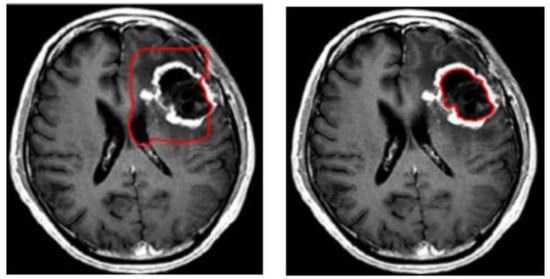 A variety of approaches have been attempted to tackle the problem of brain tumor segmentation of 3D MRI. Two methods have been proposed to deal with volumetric input. The first of these uses the idea of natural image segmentation, where the 3D volume is cut into 2D slices, and a 2D network is then trained to process each slice individually or sequentially. The second method involves cutting the volume into patches, then training a 3D network to process these patches. In the following stage, the two methods use a sliding window to test the original volume. Both methods have advantages and disadvantages []. Due to varying resolutions in the third dimension of the MRI dataset, 3D-MRI images are converted into 2D slices. Within the second category, level set based segmentation is broadly used. The level set method provides a direct way to estimate the geometric properties of the evolving structure. Figure 3 shows an example of brain tumor segmentation using level set after initializing the initial contour [,]. The advantage of using a level set representation is its ability to represent contours of complex topology and handle various topological changes, such as merging and splitting, in a natural and efficient way. To solve this optimization problem, gradient descent is used as an effective search method within the level set technique. However, the main drawbacks of gradient descent methods are their sensitivity to local optima and slow convergence.
