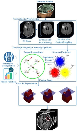 In order to detect 3D-MRI brain tumors accurately, contours should be determined correctly. To achieve this goal, the proposed model fuses semantically k-means and DA optimization. Herein, the semantic fusion is achieved using k-means inside DA clustering, i.e., rather than using a random center of the mass of the neighborhood (cluster centers) within DA clustering, k-means regulate these accurately. Figure 4 shows the main model’s components and the way they are linked to each other. Our proposed brain tumor segmentation model consists of three main steps: pre-processing, two-step dragonfly algorithm clustering, and the last phase, level set segmentation. The following subsections discuss these components in detail.