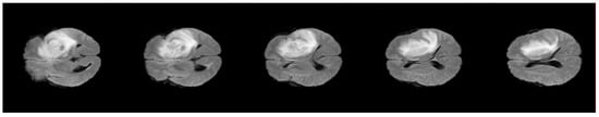 Segmentation of MRI brain tumor scans always challenged by poor image quality, the main cause for image degradation in MRI is the contamination of the MRI images with noises like irregularities []. Pre-processing operations are required to enhance the image quality, the target for these procedures is to reduce the contaminated noise and improve segmentation of image edges by eliminating inhomogeneous areas of the image. In the proposed model, four steps were applied: conversion of the 3D-MRI into 2D slices, skull-stripping, anisotropic diffusion, and contrast enhancement. Figure 5 shows an example of one patient’s 2D slices after pre-processing. Herein, the conversion process was applied using 3D Slicer, which is an open- source software web application for medical image informatics, image processing, and three-dimensional visualization.
