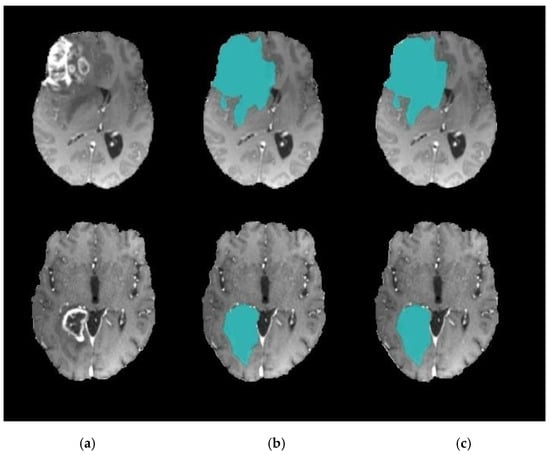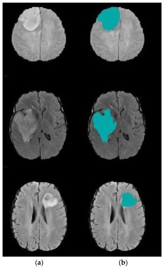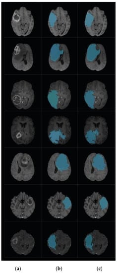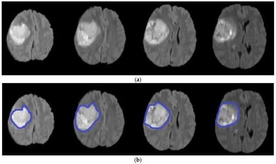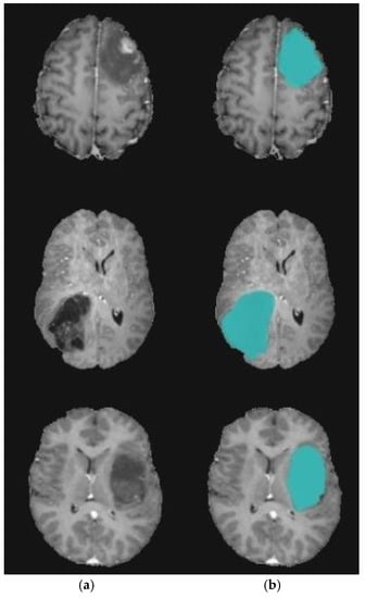 In this section, the performance of the proposed model is validated on MRI volumes from 285 subjects with different forms of cerebral tumors in terms of form, position, size, and intensity. These 3D-MRI brain tumor data were obtained from the BRATS 2017 (Brain Tumor Segmentation) test and challenge dataset [,]. The experiment was carried out using an Intel, Core i3 CPU with 8.00 GB of RAM using MATLAB software R2018a. Herein, accuracy, recall, and precision are used as an evaluation metrics.