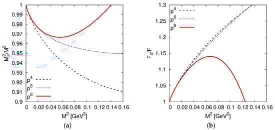 (a) The pion mass , and (b) the decay constant  at next-to leading order (NLO), next-to-next-to leading order (NNLO) and NNNLO, respectively. By definition, the leading order (LO) is identically unity. This plot is taken from  [].