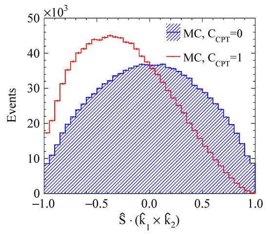 A simulation of positrons emitted from a source without CPT-violating effects in ortho-positronium annihilations results in a distribution of the operator presented in the hatched blue histogram presented in Figure 2. Red histogram in the same figure corresponds to the distribution obtained if maximal violation of the symmetry () is assumed. While the existing measurements exclude values of beyond the level, the exaggeration in Figure 2 was used to visualize the effects detectable through determination of the distribution of this angular correlation. It is visible that while detection efficiency peaks for values corresponding to the decay plane normal being close to perpendicular to the spin quantization axis, it does not drop to zero close to the extreme values of the correlation, in contrast to the previous measurement [7].